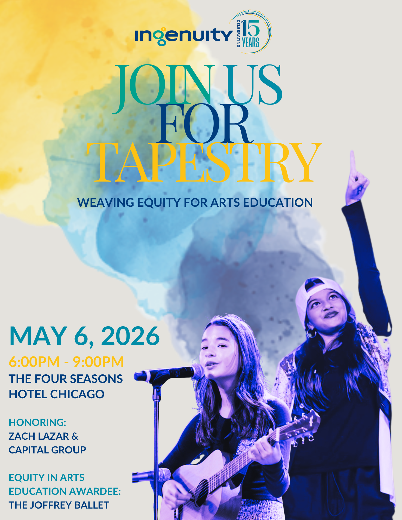 Non-Refundable Sponsorship and Ticket Contributions: In the unlikely event that Tapestry is canceled or rescheduled, please note that all sponsorships and ticket purchases are non-refundable and will be considered a charitable donation to Ingenuity. Your generous contribution plays a critical role in helping us further our mission to provide equitable access to arts education in Chicago Public Schools. We are incredibly grateful for your support and belief in the transformative power of the arts.